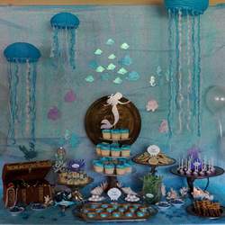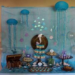 This beautiful party was for a lovely young lady that turned 12. With helium balloons as bubbles and fish hanging from the ceiling. Her home was transformed into a under sea world. Complete with seaweed and under water treats!